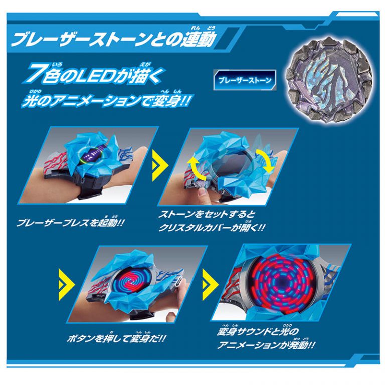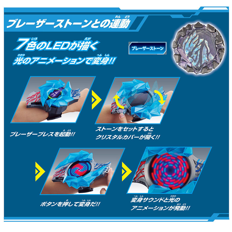 สินค้า DX เบลซาร์เบรส สามารถเล่นกับเบลซาร์สโตนซีรีส์ที่จำหน่ายแยกตามไลน์ต่างๆ ได้ ซึ่งผู้เล่นสามารถเพลิดเพลินไปกับ เสียง และแสงไฟจากภาพอนิเมชั่นที่ปรากฏออกมาอย่างมากมายตามสโตนแต่ละแบบที่ใส่เข้าไป