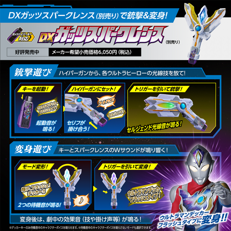 เอนเชี่ยนสปาร์คเลนส์ คือต้นแบบของกัตซ์สปาร์คเลนส์ เป็นไอเทมพิศวงแห่งแสงที่เคยถูกใช้เมื่อยุคโบราณกาลเมื่อ 30 ล้านปีก่อน 【สินค้าภายในเซ็ต】 - DX Ancient Sparklence (ใช้ถ่าน AAA จำนวน 2 ก้อนในการเล่น) - แบลงค์คีย์ (สินค้าชิ้นนี้ไม่มีเสียงในตัว) - คู่มือ